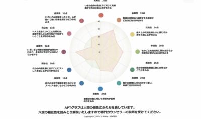 とても面倒見が良く人と関わる事が大好きとデーターで読み取れます。色々な方が頼って来られますので、しんどくなるようでしたら、少し意識をして断る事も必要ですよ。とアドバイスさせていただきました。感受性が少し点数が低い中、表出性や共感性が高いので、努力をされながらビジネスをされているのだと思われます。