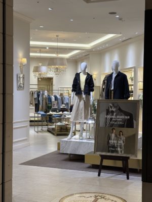 ネイビー+ボーダーのスタイリングから、店内ラックのボーダーアイテムへ自然に誘導されるVMDは、さすがハイブランドと感じる完成度。
